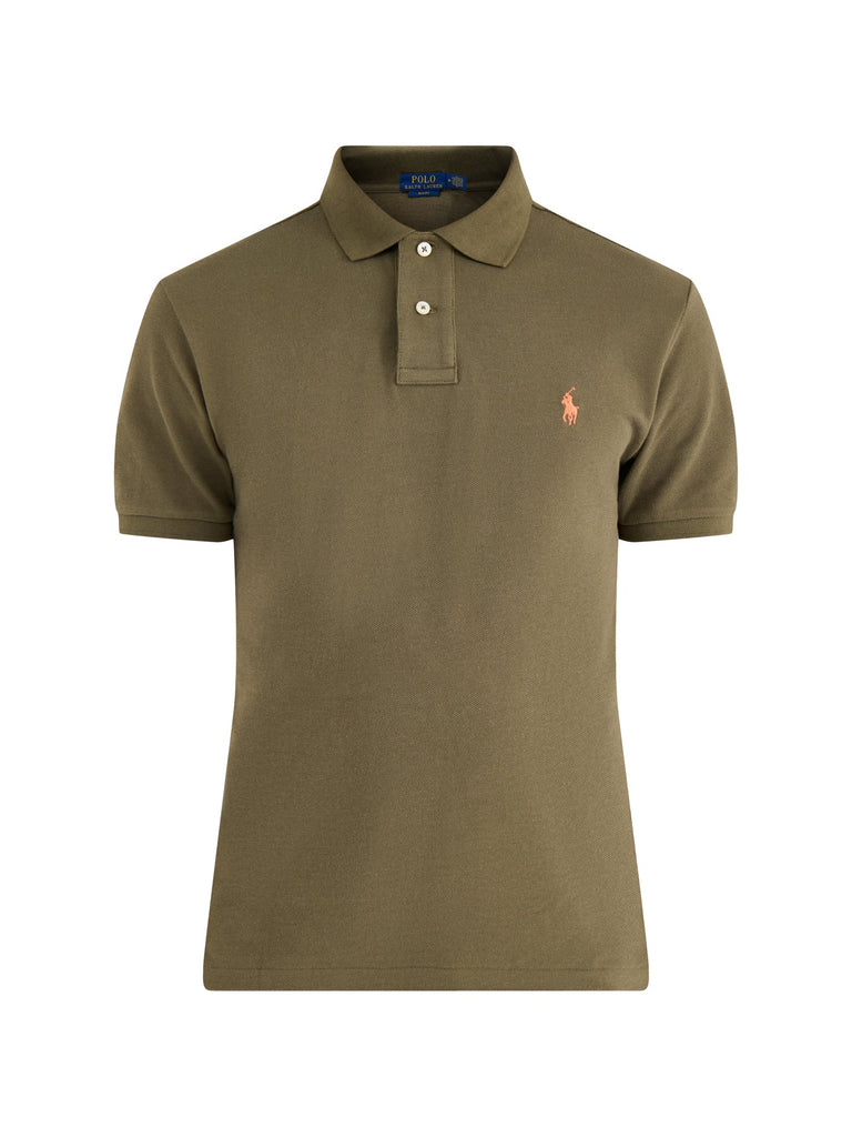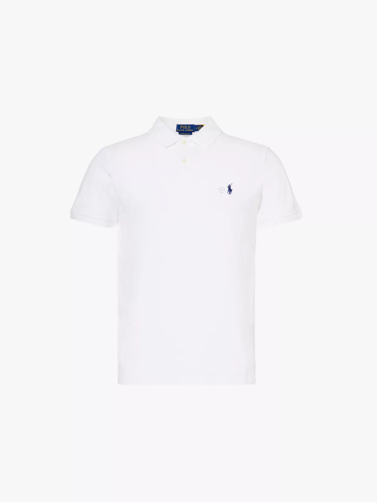 Button-fastening neck red embroidered designer crest ribbed cuffs side splits longer back hem